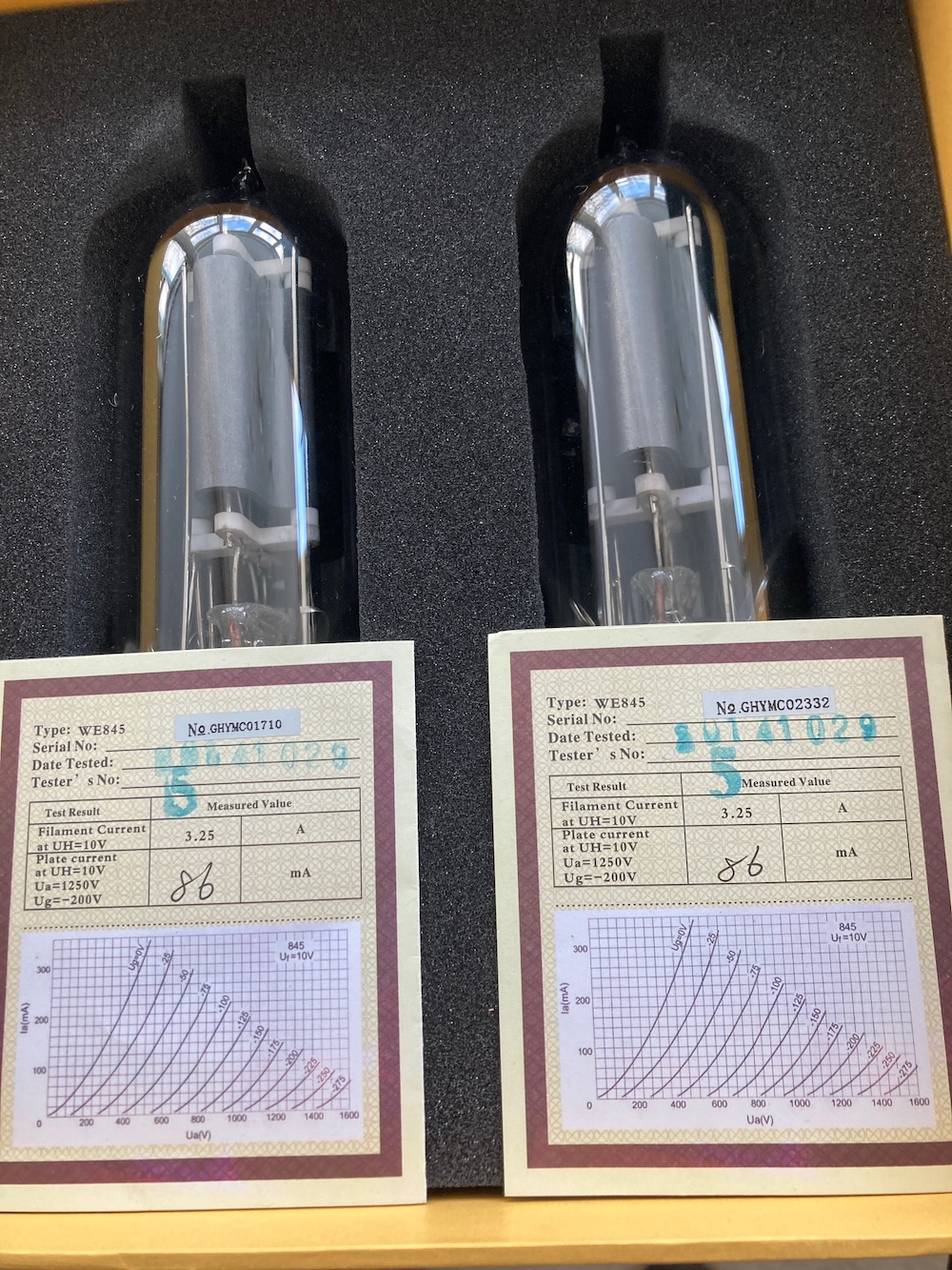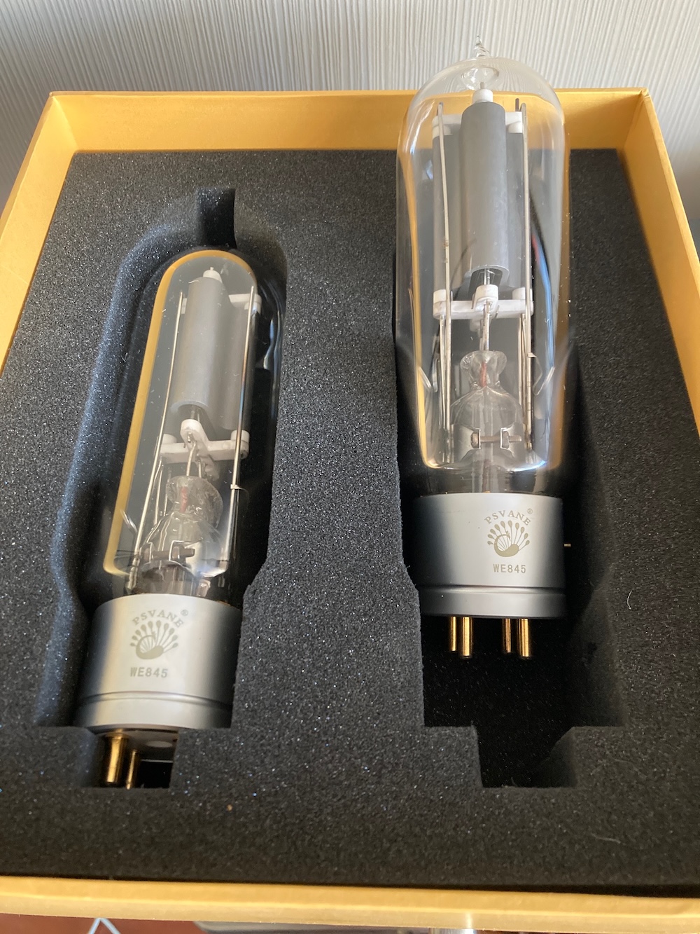 For a good friend I sell these grade A Western Electric 845 replica's by Psvane. These are bought as spare pair but became abundant. Brand new, in original box, with testdata, as it is a matched pair. A pair from the shop will set you back around 1000€. These are from 2021 when Psvane built quality was better compared to current production.. Asking price is 795€. P&P and import is for the buyer, as well the risk for transportation, though it will be well packed. Drop me a line if your are interested or want to make me an offer! Please state the shipping address as I will not ship to any country worldwide..