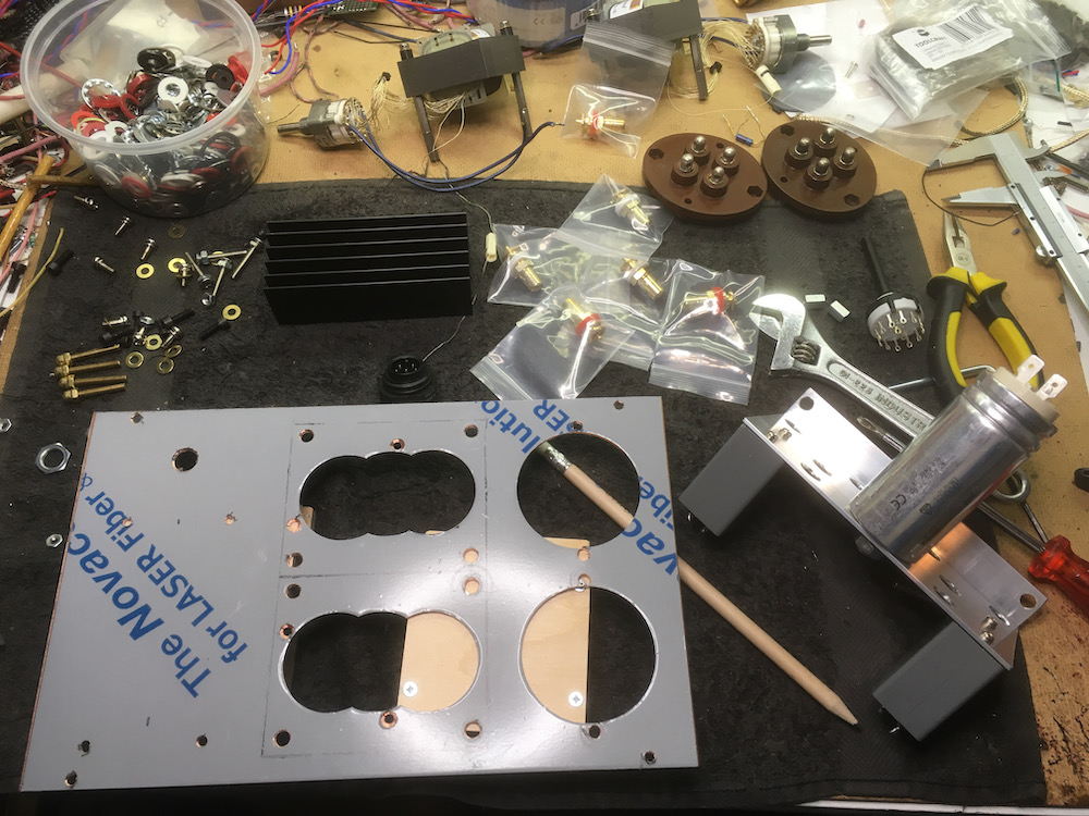 See the parts, AudioConsulting TVC's, heatsinks, input transformers, MKP in oil psu capacitors, faceplate, all neatly laid out for assembling (lol).