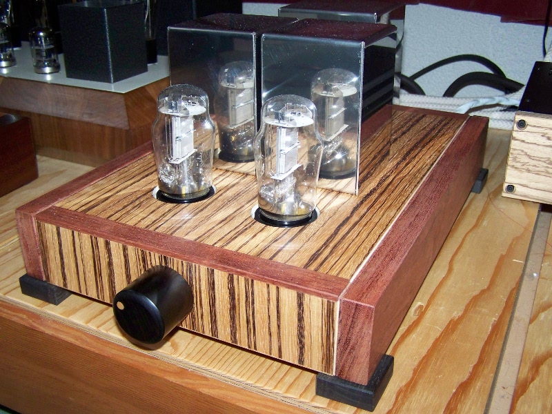 | De voltooide voorversterker. Zebrano voor- en bovenzijde met Bubinga zijkanten en accenten. Art-deco voetjes en volumeknop uit African Blackwood. De Silberglut transformatoren worden geleverd in gepolijst RVS.. |