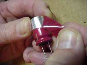 | Removing the plastic insulation. Remember which one of the leads is the negative one! (with new capacitors, the short lead is negative). |