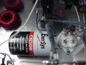 De loodaccu (Conrad) welke aan de kathode van de buis is gekoppeld. Buishouders zijn van Yamamoto (zilver). |