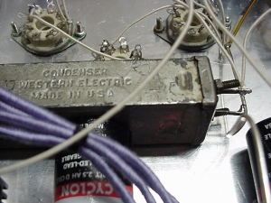 1e afvlakking: de 1uF condensator. Hier is gekozen voor "het best verkrijgbare oude spul": Western Electric papier-in-olie. |
