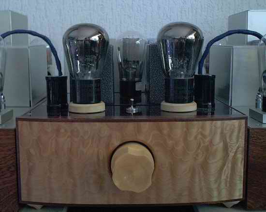 The preamp is built on a piece of copper which is bent at 90 degrees at the rear. Sides are made of mahogany and over the front an extra piece of beautiful quilted maple is placed. Even the knob for volume adjusting is made out of wood: Buxus.The copper plate is painted dark-red and the tube sockets are also made of wood. Yes, Cees is really into wood! The preamp is a choke loaded 4022A. Chokes are from Tribute, amorphous core. Coupling capacitors are Ultra Tone and resistors are 2 watt Tantalums. Powertransformer is made by Stoet and supply chokes are AE-Europe, 6-chamber. A BlackGate WKZ completes the supply. You can look at the schematic here!